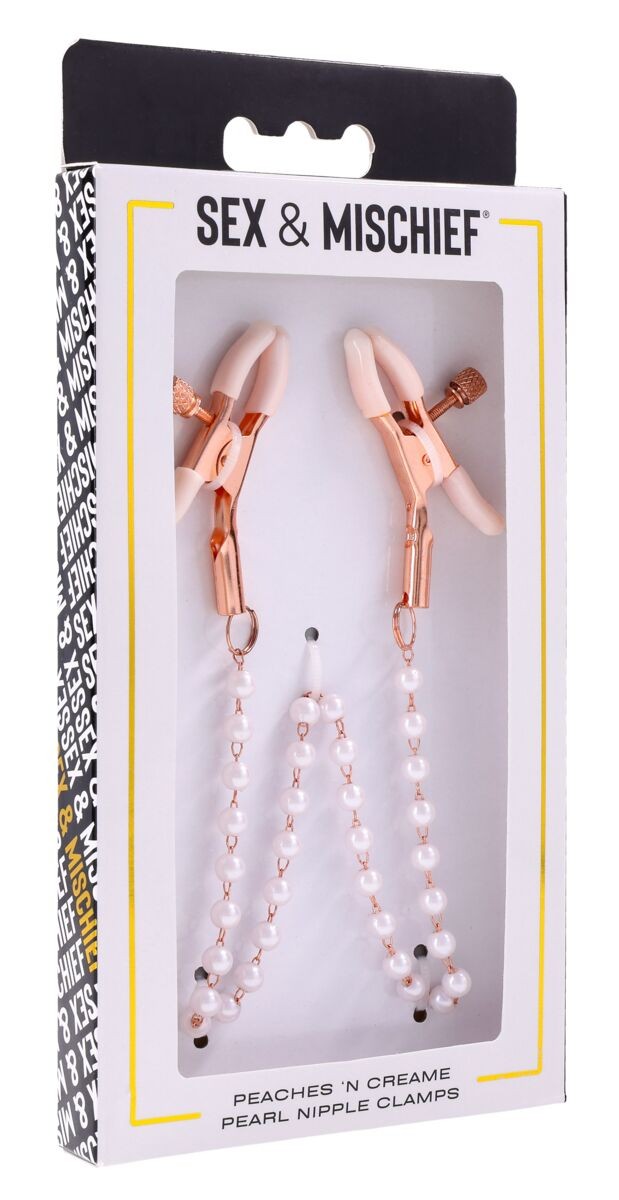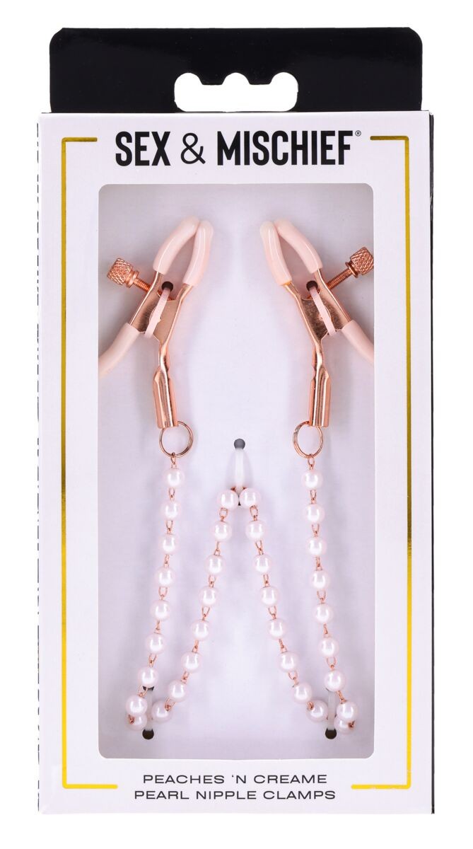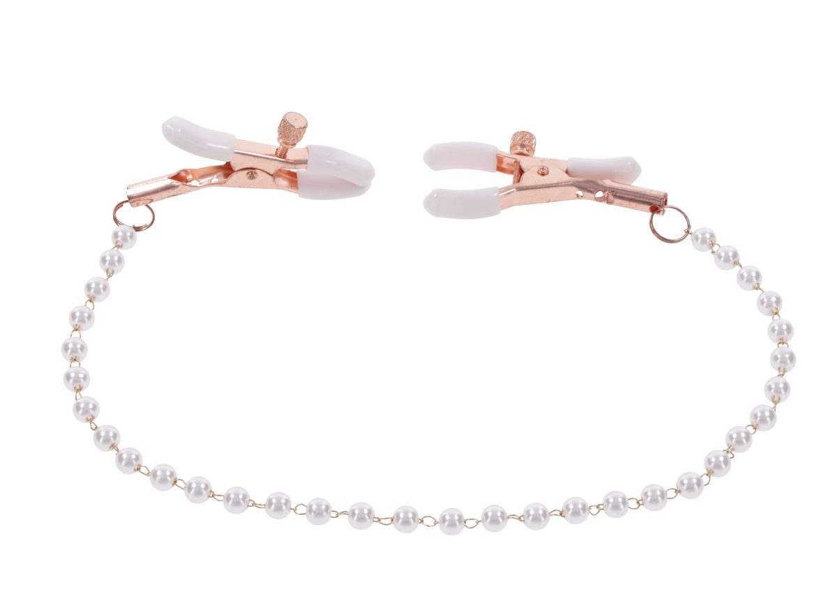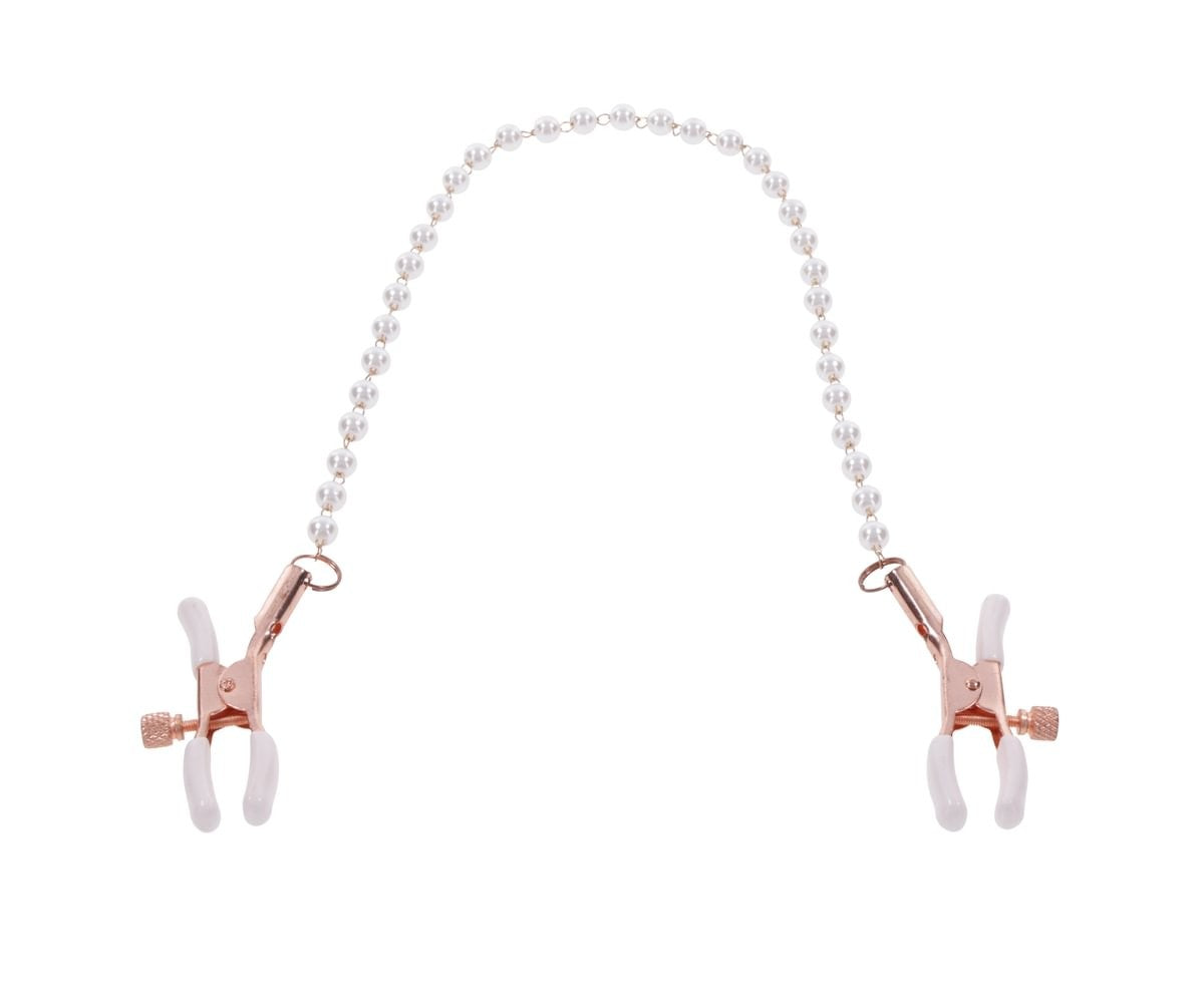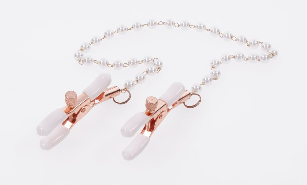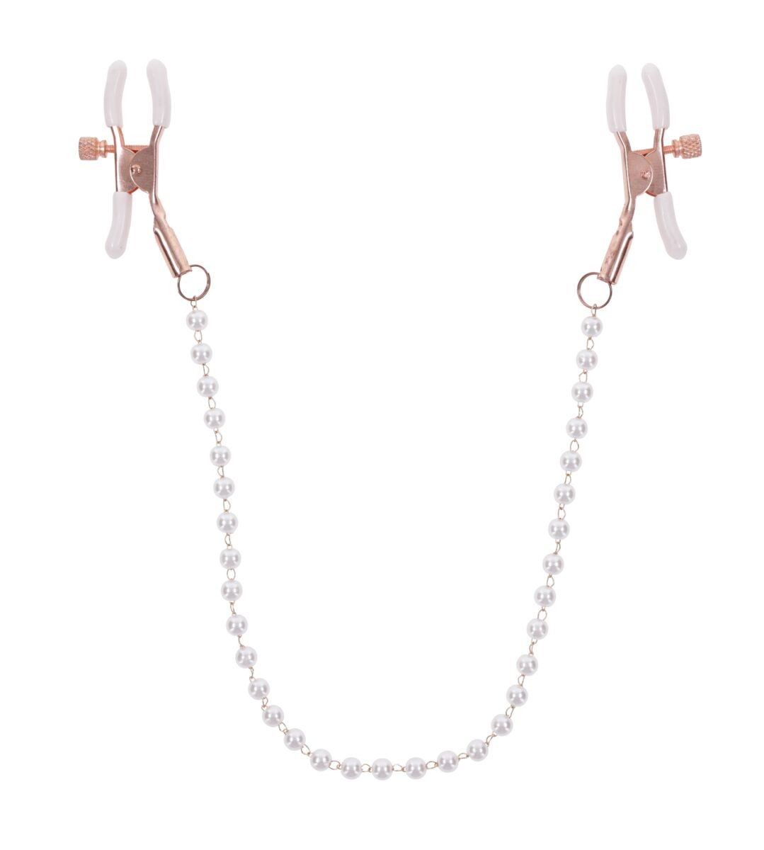 Doppi morsetti regolabili in uno splendido oro rosa con dettagli in perla. Le punte in gomma bianca aggiungono un tocco di colore al tuo gioco e impediscono alle pinze di scivolare risvegliando intense sensazioni nel corpo.